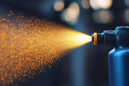 A striking image featuring a red spray nozzle emitting a vibrant blue mist against a dark background. The dynamic flow captures energy and creativity.