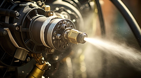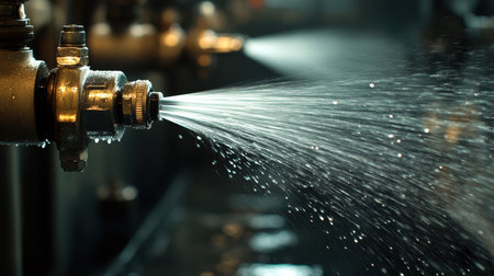 A close-up image showcasing water spraying from an industrial pipe. The droplets create a dynamic spray pattern set against a dark background, highlighting the machinery's functionality.