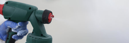 Hand holding paint spray gun Paint spray on floors Image of the painter's arm hand holding industrial size spray gun used for industrial painting and coating and isolated on background clipingpart
