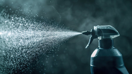 A hand holding a spray bottle emitting a fine mist on a moody dark background, symbolizing control and precision