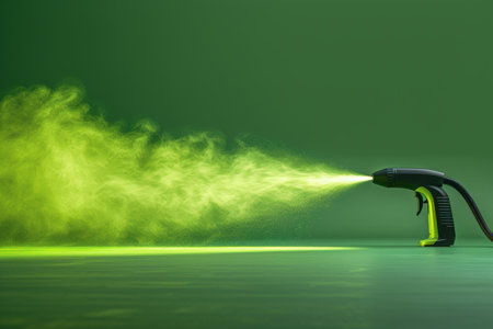A yellow blow dryer emits a spray of water against a vibrant green background. The water droplets create a dynamic and interesting visual effect.