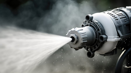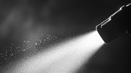 This striking image features a spray nozzle releasing a fine mist against a black background, creating an atmospheric and dramatic effect. Perfect for creative projects.