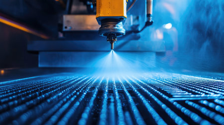 The image depicts an advanced water jet cutting process featuring high-pressure machinery producing a fine blue spray while working on a steel surface in an industrial setting.