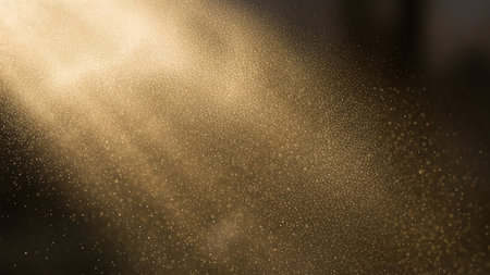 Golden dust particles floating and shimmering in a soft, illuminated light beam. Clear details and vibrant col...