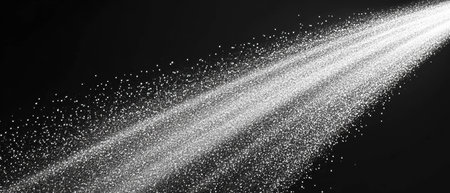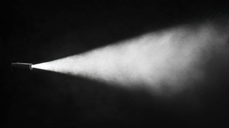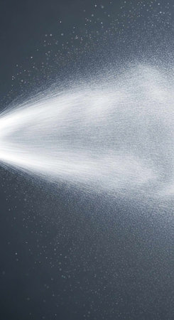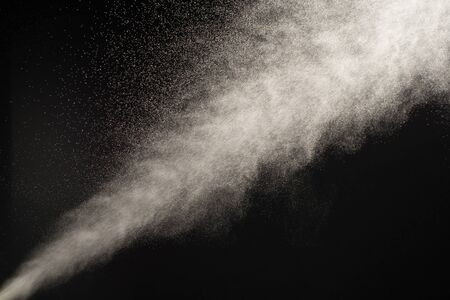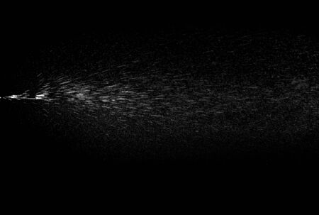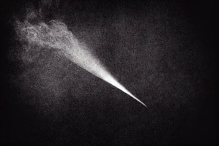 Against a stark black background, a fine spray of white mist expands diagonally. The cloud of droplets begins as a dense stream and gradually disperses into a light haze.