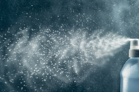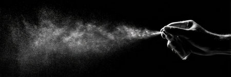 A hand holding a spray bottle emitting a fine mist on a moody dark background, symbolizing control and precision