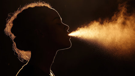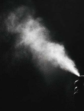 A hand releases a fine spray of mist against a contrasting dark background, adding mystery and depth to the scene, evoking curiosity and fascination.