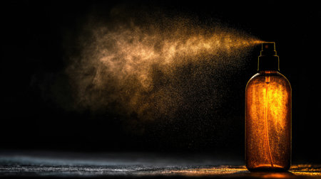 A spray bottle releases a soft golden mist, creating a mysterious atmosphere in a dark, cinematic environment that captivates the viewer.