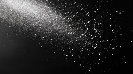 This striking image captures a cascade of glittering particles floating gracefully against a deep black background, creating a mesmerizing light effect.