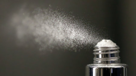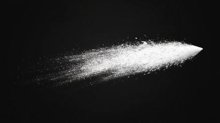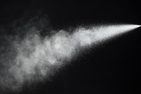 This image captures fine white powder spraying from a metallic nozzle, creating a dynamic visual effect with soft focus and textures in a minimalist context.