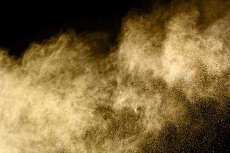 Golden powder explosion on black background. Freeze motion.