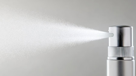 Close-up of an air freshener spray nozzle, with a fine mist spraying outward, on a white background