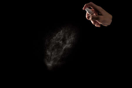 Human hand spraying sanitizer over black background