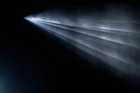Light beams cutting through dark smoke in a dramatic scene