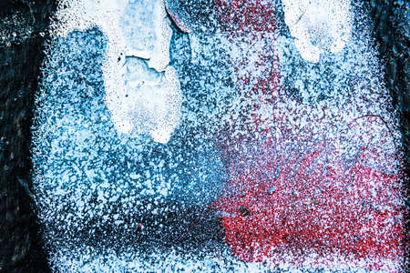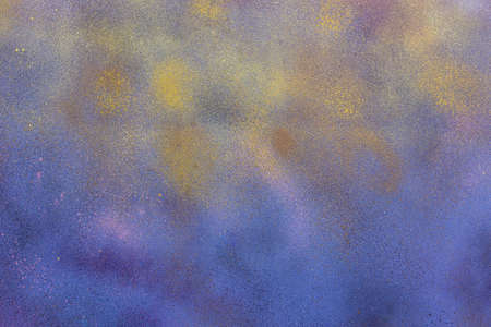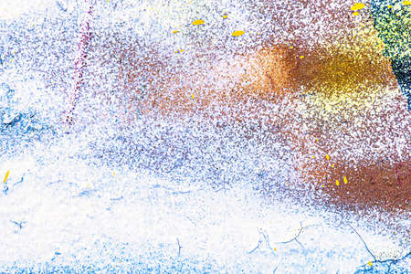 Messy paint strokes and smudges on an old painted wall. Purple, blue, pink, magenta, white drips, flows, streaks of paint and paint sprays
