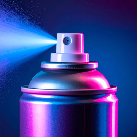 Close-up of colorful powder jetting from a spray can tip with intense lighting effects