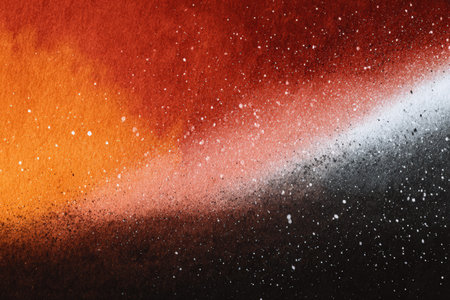 Vibrant abstract watercolor illustration showcases a gradient of orange, red, and black tones with white splashes, perfect for creative projects and artistic expression