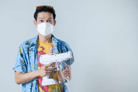 Asian man wearing medical mask holds gun to spray disinfectant, Songkran Festival in Thailand, Under covid-19 prevention measures, Copy space.