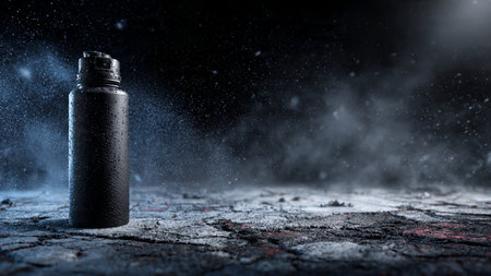 Closeup of spray can spraying aerosol insecticide or fragrance mist into the air in slow motion on black background. Air freshener on black background.