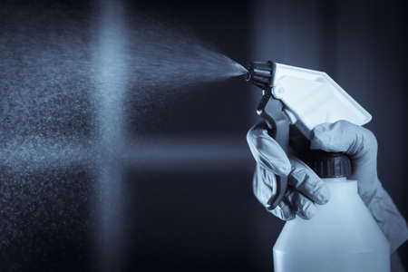 Hand of anonymous person using gloves and a water bottle sprayer against black background.