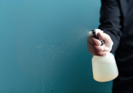 Man in rubber glove sprays disinfectant on a glass, selective focus. Copy space.