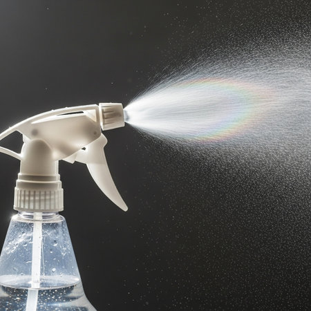 Close-up of a water spray bottle releasing a burst of mist, illuminated by dramatic lighting on a dark backdrop