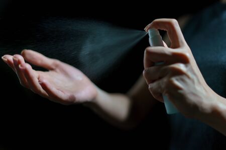 Woman hand using sanitizer spray, alcohol spraying disinfectant to stop spreading coronavirus or COVID-19.
