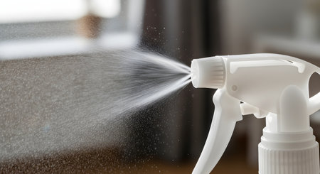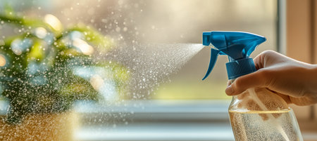 A vibrant image of gloves holding a spray bottle, with droplets landing on a dusty surface ready for cleaning.