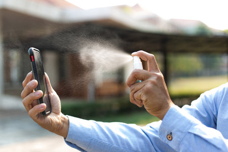 Cropped shot of woman applying sanitizer alcohol spray on her smartphone for disinfection isolated over gray background