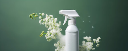 Blank plastic spray detergent bottle with flowers. Spraying floral air freshener