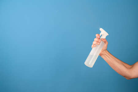 Do the cleaning of the house, a call for cleanliness and order, a mans hand holds a cleaning agent with a spray gun, blue background