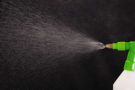 Air pump water spray bottle. close up of a spraying water drops isolated on black background.