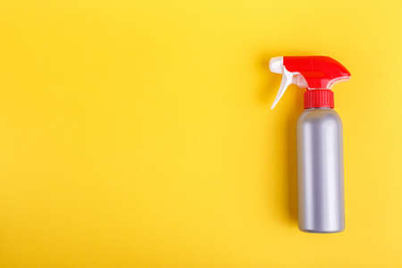 A high angle shot of a plastic spray bottle isolated on a yellow background
