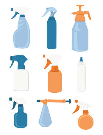 Set of spray plastic bottles colorful and different forms spray for water or chemical liquid antiseptic flat vector illustration isolated on white background.