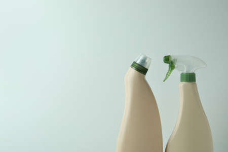 Blank detergent bottles on white background, space for text