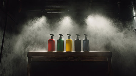 A stunning image featuring five colorful spray bottles positioned on a wooden table, surrounded by soft smoke and dramatic lighting. Perfect for various design projects.