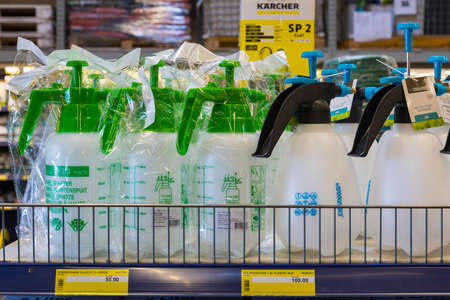 February 24, 2021 Balti Moldova. Huge supermarket, garden department. Showcase with bottles for spray application with fertilizers and pesticides