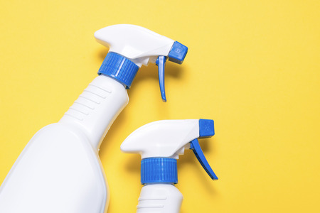 White bottle of spray for cleaning on blue yellow background. Top view. Minimalism