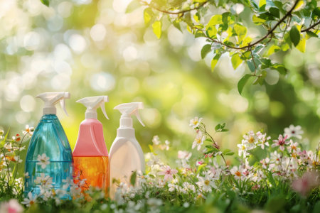 Three vibrant spray bottles stand on a soft bed of flowers, illuminated by warm sunlight. The tranquil garden setting offers a refreshing vibe of nature and cleanliness.
