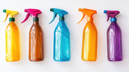 Colorful cleaning spray bottles in a row against white background. ai generated