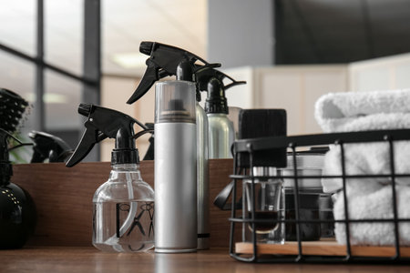 Different hair sprays on table in beauty salon