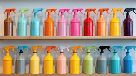 Vibrant spray bottles filled with various cleaning liquids are lined up, showcasing bright colors and potential for effective cleaning in modern households.