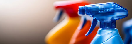 Colorful Cleaning Bottles A Row of Plastic Spray Bottles with Shallow Depth of Field
