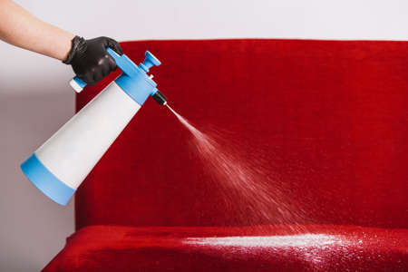 professional cleaning, hands in black gloves clean the stain from the sofa with a wooden spatula, space for text. high quality photo