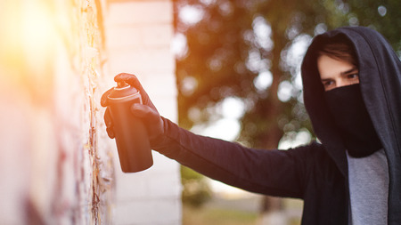 Hooded man in mask drawing graffiti by spray can with paint. Graffiti artist is drawing. Aerosol vandalism closeup. Urban concept. Sunset