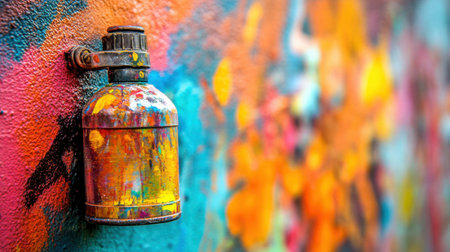 A close-up view of a vibrant paint can resting against a graffiti-covered wall, showcasing a mix of bright colors and abstract art, embodying urban creativity.