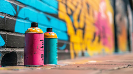 Brightly colored spray paint cans rest against a vibrant urban mural in a city alley during daylight hours
