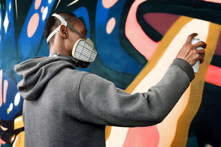 Graffiti artist in action, drawing on the wall with aerosol spray paint in a can, wearing protective face mask / respirator with filters. Street art culture concept.