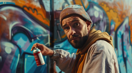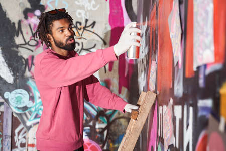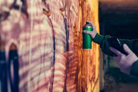 Graffiti artist holding spray can in hand and painting urban wall. Street artist in the process of work. Youth street culture