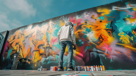 Street artist creates vibrant mural with spray paint in urban alley. Bright colors on walls reflect artistic expression in creative city landscape. Concept of street art, urban culture, creativity.
